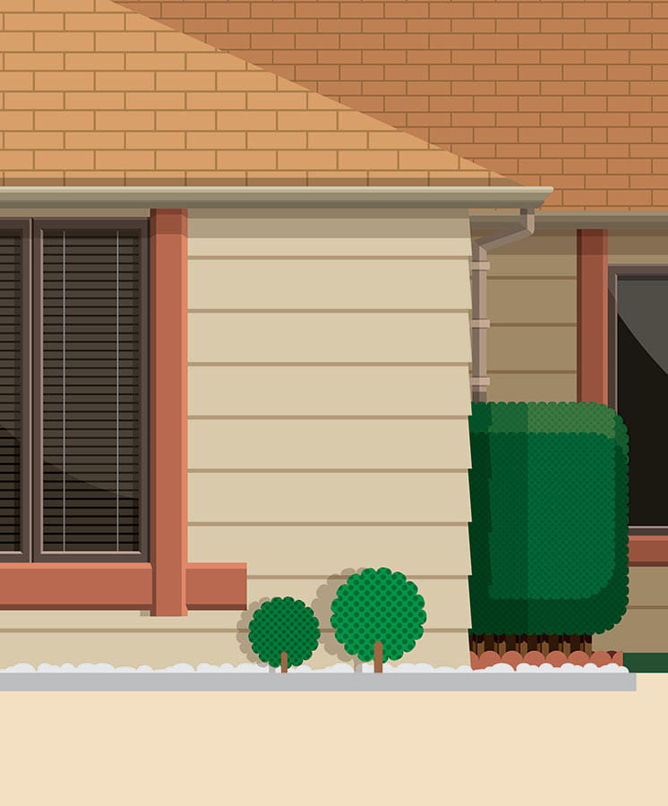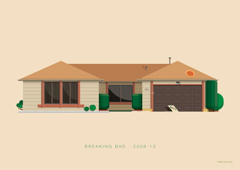 Plakat z autorską grafiką inspirowany serialem Breaking Bad, stworzonym przez Vince'a Gilligana. Pochodzi z serii "Słynne scenerie" i przedstawia dom Waltera White'a.