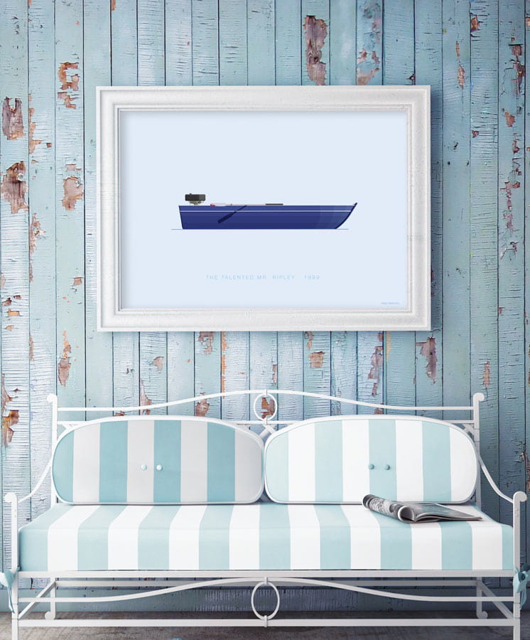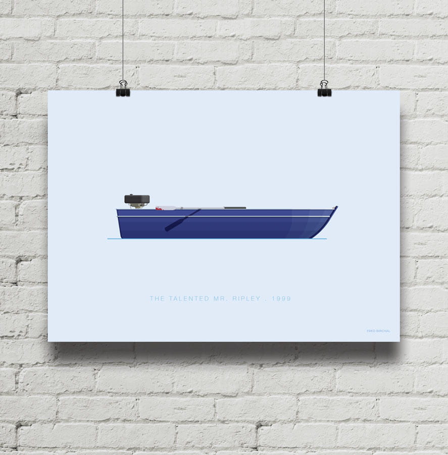 Plakat z autorską grafiką inspirowany filmem Utalentowany Pan Ripley (The Talented Mr. Ripley), reż. Anthony Minghella. Pochodzi z serii "On Board" i przedstawia łódkę na której odbywa się finałowa konfrontacja w filmie.