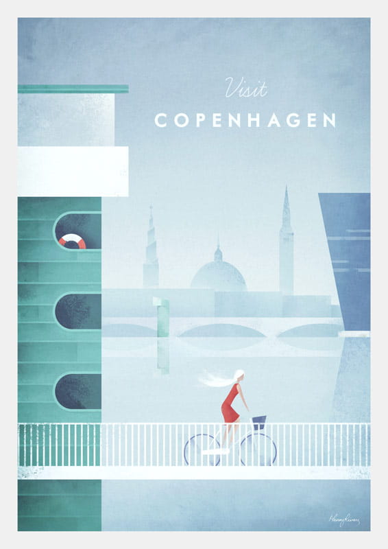 Plakat w stylu vintage przedstawiający rowerzystkę przejeżdżającą przez most Knippelsbro. W tle widoczna jest panorama miasta Kopenhaga z nowoczesną biblioteką Black Diamond oraz barokowym Kościołem Najświętszego Zbawiciela z jego charakterystyczną spiralną wieżą. Inspirowany plakatami podróżniczymi z lat 20-tych XX wieku.