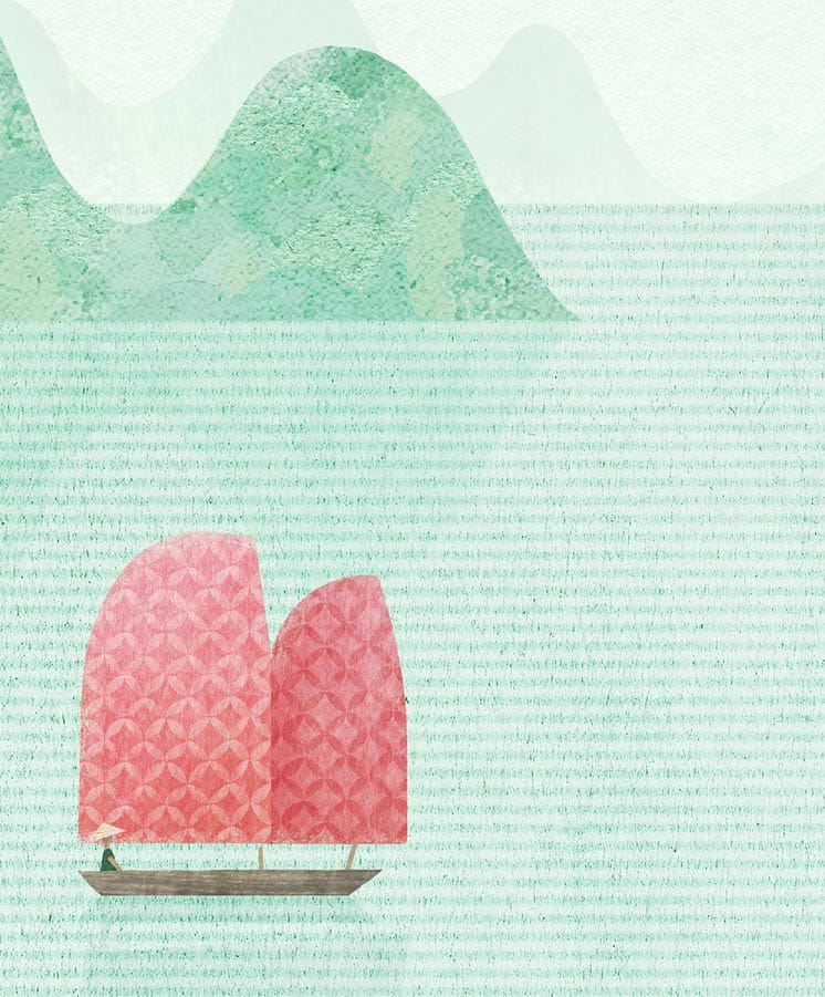 Plakat w stylu vintage przedstawiający widok na zatokę Ha Long w Wietnamie. Między charakterystycznymi wyspami wyłaniającymi się z wody, których w tamtym rejonie znajduje się ok. 1900, płynie dżonka z czerwonymi żaglami.