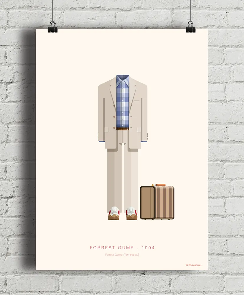 Plakat inspirowany pełnym pozytywnej energii filmem Forrest Gump, reż. Robert Zemeckis. Przedstawia strój głównej postaci odtwarzanej przez Toma Hanksa, za którą to rolę w 1994 roku otrzymał Oscara. Stonowane kolory plakatu sprawdzą się w każdym wnętrzu. Każdy element kostiumu odtworzony został z geometryczną precyzją i nutą humoru - jak np. plamki błota na sportowych butach. Jak mawiał filmowy (i książkowy) bohater: "Życie jest jak pudełko czekoladek. Nigdy nie wiesz, co Ci się trafi".