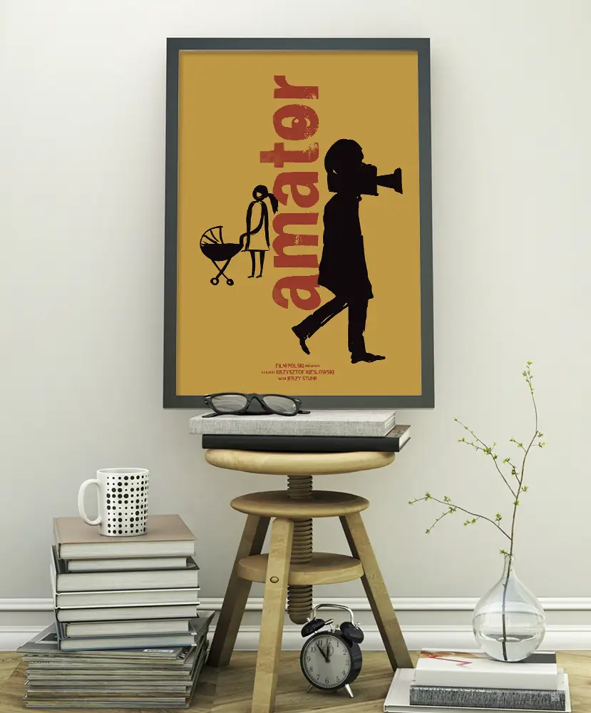 Plakat inspirowany polskim filmem Amator w reżyserii Krzysztofa Kieślowskiego. Kino moralnego niepokoju w najlepszym wydaniu i niezapomniany Jerzy Stuhr w roli Filipa. Plakat filmowy Amator z graficzną prostotą oddaje główne motywy opowieści. Dekoracja obowiązkowa dla każdego kinomana.